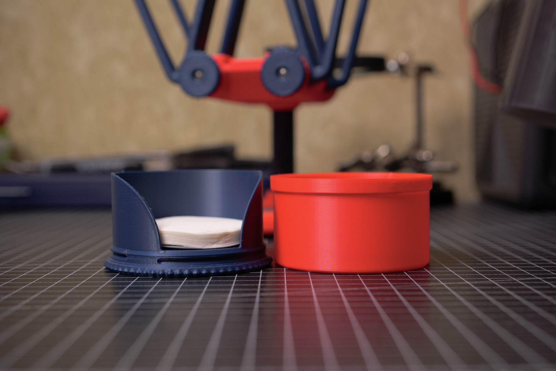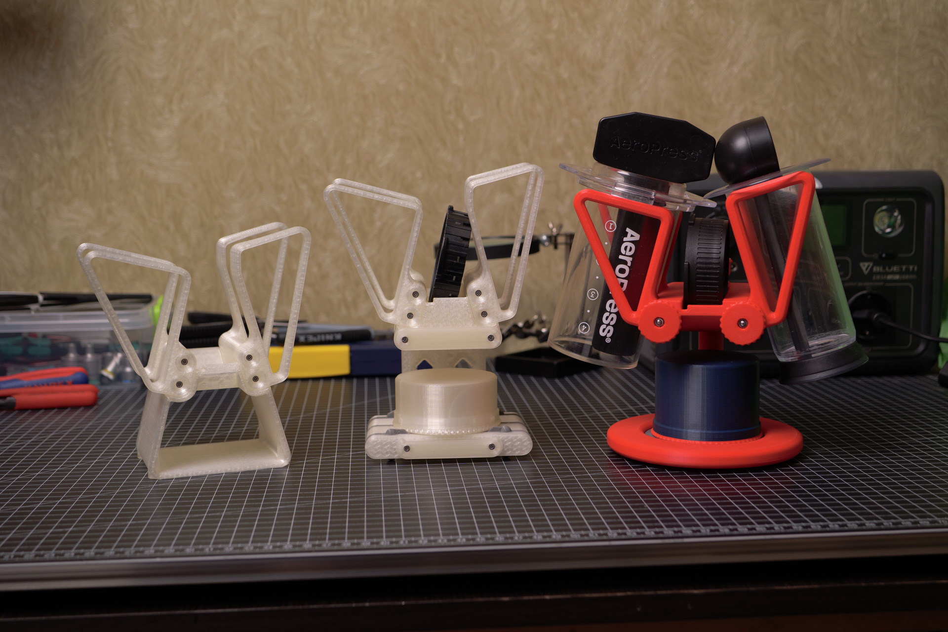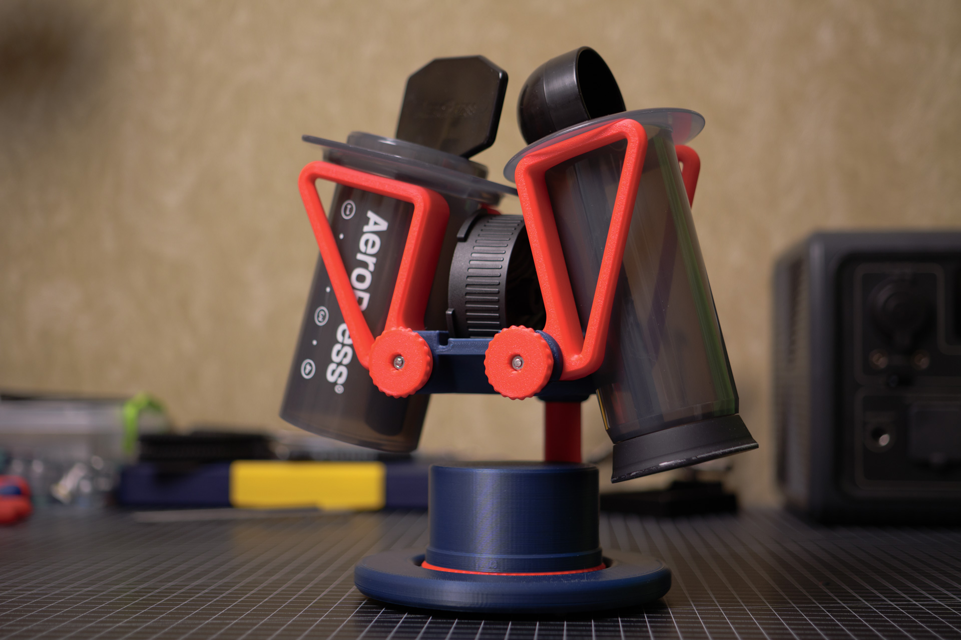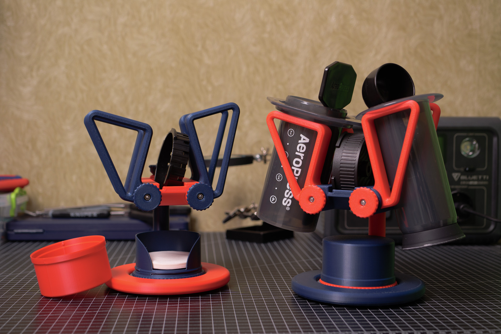 The design is adapted for printing parts in two colors. For this example I used matte PLA in ruby and navy. They match the classic gray AeroPress nicely. I’m already looking for a white‑pearl option and pastel colors. As you can see, there’s plenty of room for experimentation until I’m satisfied.