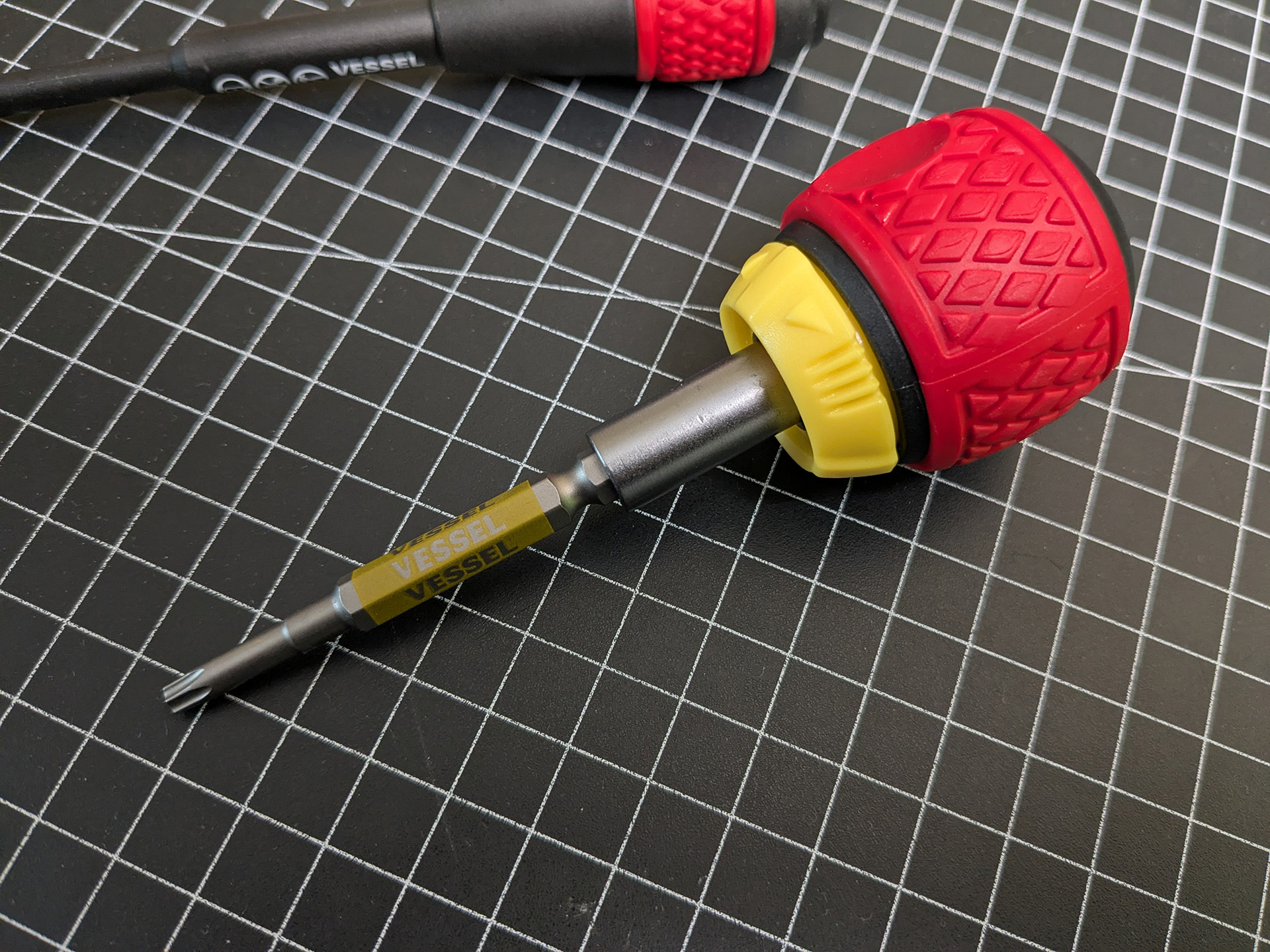 One of the well known options I tried is Vessel No.2200. It is ball grip style, looks cool, hight quality made, has ratchet in it. However user experience is totally off. Ratchet has backlash and only 36 teeth, bit holder socket is wobbly and has retention ring that wedging western style bits so it is hard to pull them out. That's why I ruled out this option and continued searching the Japanese market.